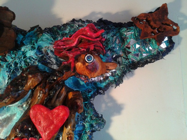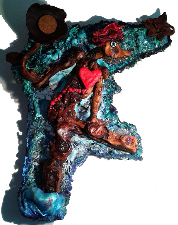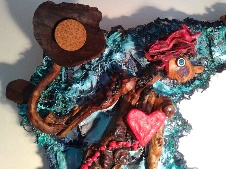 Sculpture, assemblage de racines de pin, écorces et autres bois. Collages algues,coquillages, plastique.