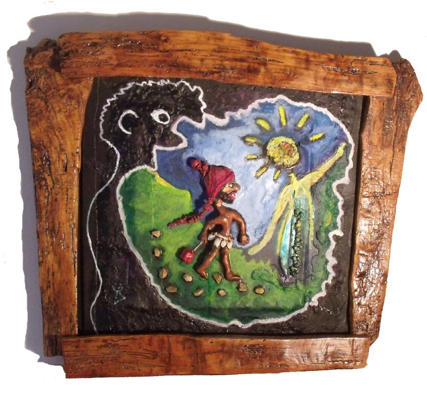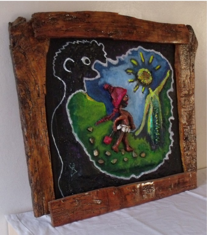 Peinture acrylique sur bois. Collage bois, plastique, cailloux, coquillages, perles. Cadre bois. Résine.