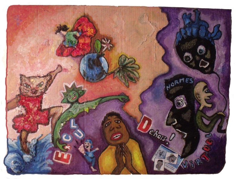 Peinture acrylique sur bois. Collage carton, coquillages, sable, papier. Résine