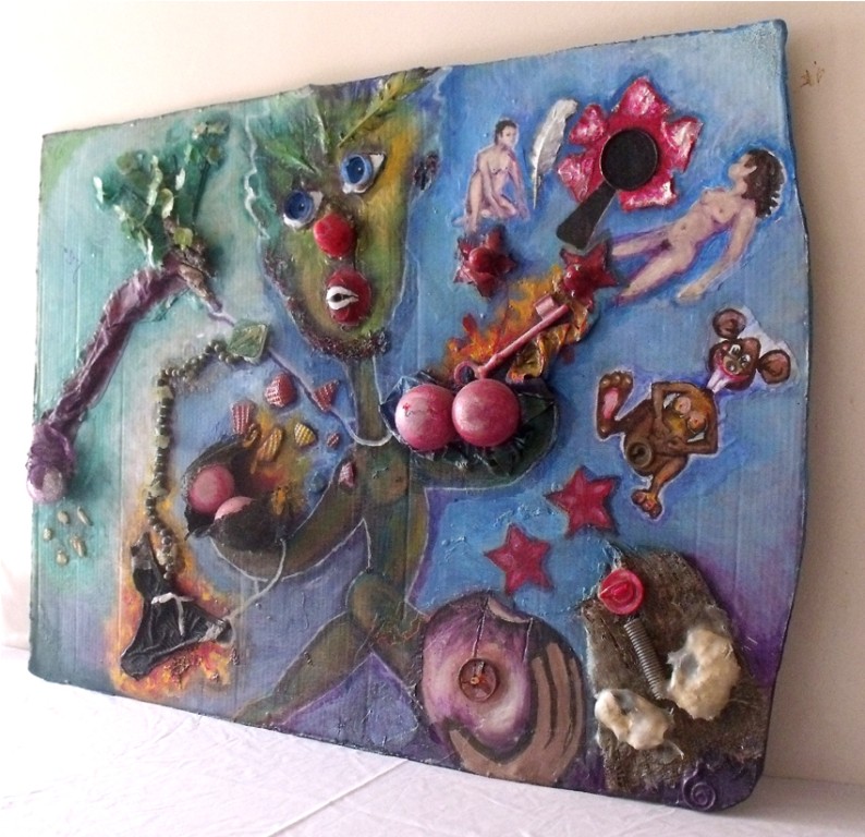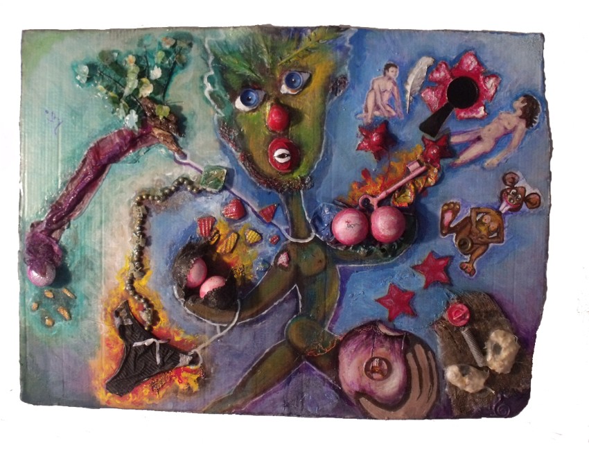 Sculpture bois flotté. Collage os, plastique, croûte vernis, fibre de verre. Résine.